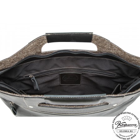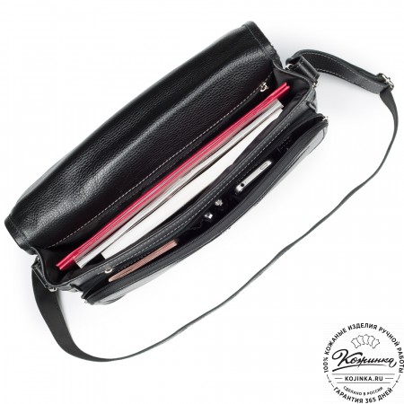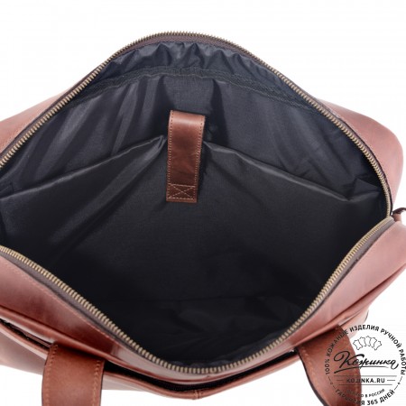 У сумки одно отделение, внутри большой карман с жесткой стенкой, который фиксируется кожаным хлястиком на липучке. В этом кармане удобно носить ноутбук или планшет.