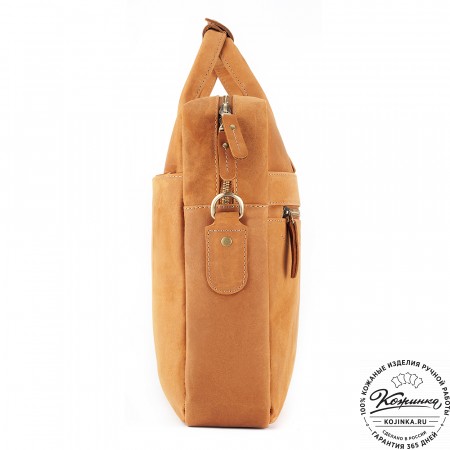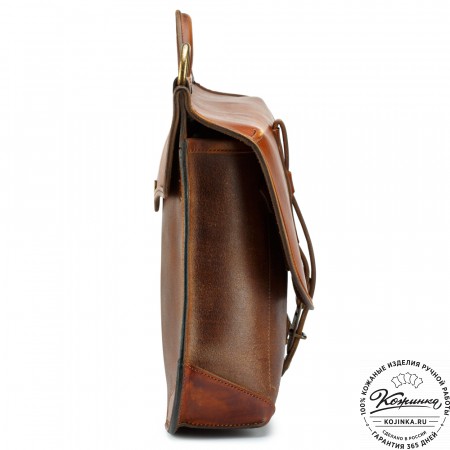На модели представлена сумка "Форман" из кожи Крейзи Хорс рыжего цвета.
