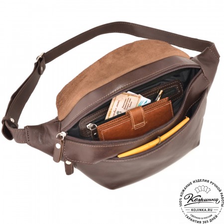 На передней стенке сумки расположен объемный карман на молнии. Внутри тканевая подкладка и карман на молнии для документов.