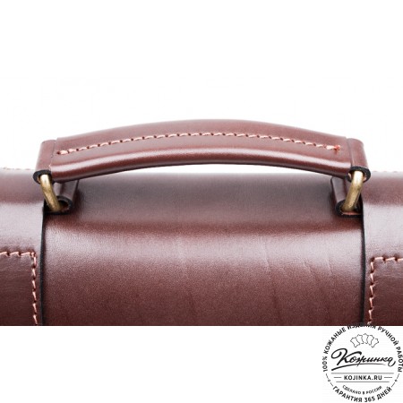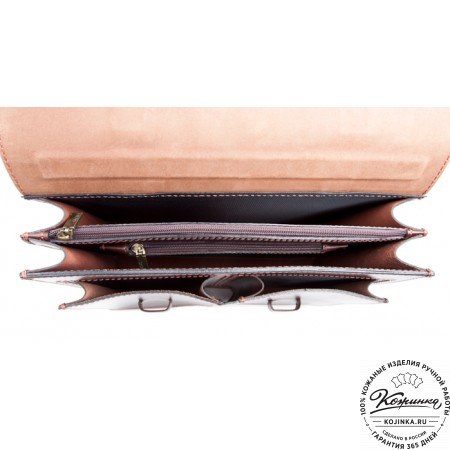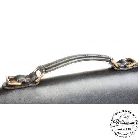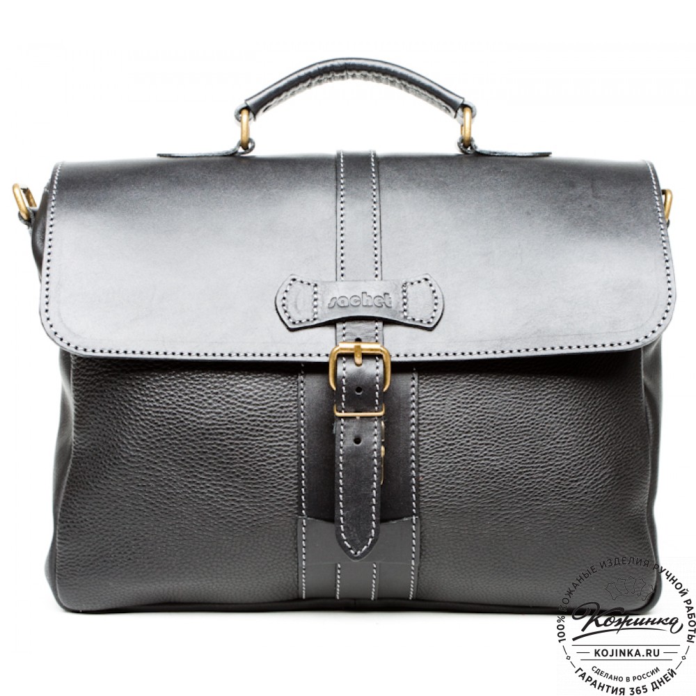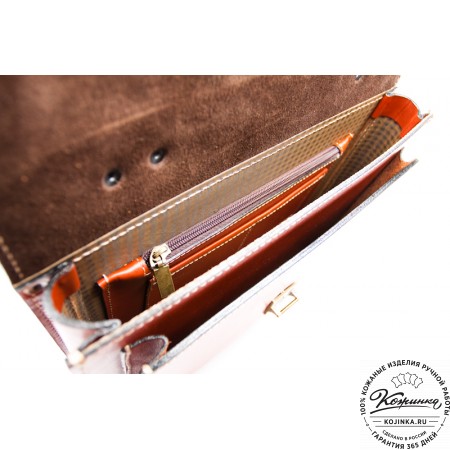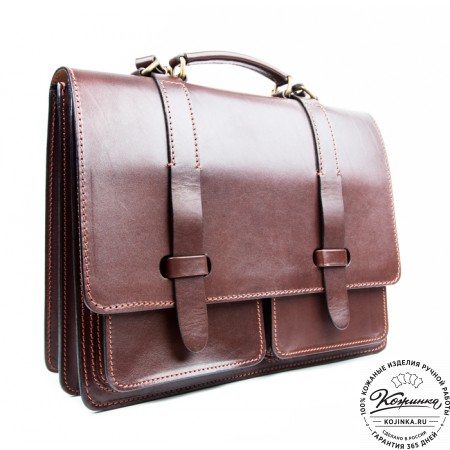Портфель из 100% натуральной толстой кожи, закрывается на одну пряжку с регулируемой длиной. Сверху конструкция укреплена жёсткой толстой кожей. Внутри два удобных отдела разделённых перегородкой с карманом на молнии. В переднем отделении есть дополнительный малый карман на молнии. На задней стенке имеется один накладной кожаный карман и второй карман на молнии - для быстрого доступа.