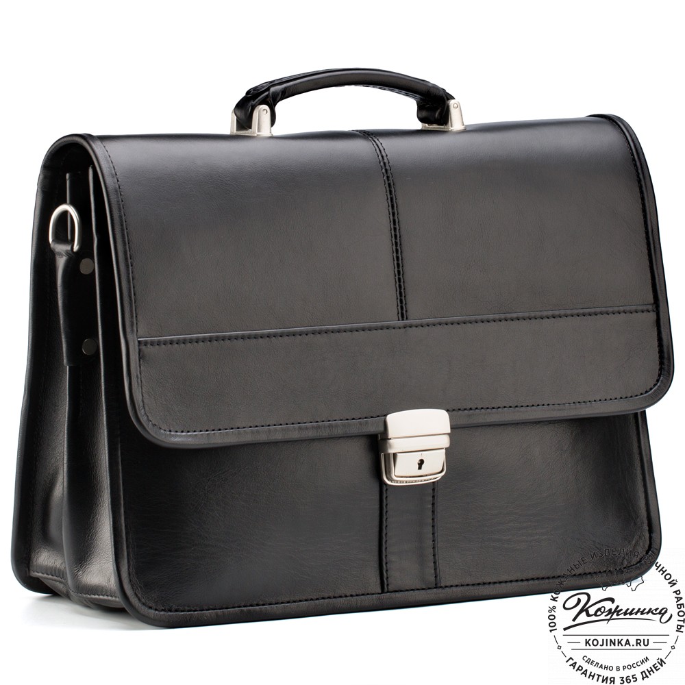 Кожаный портфель "Вильгельм" (чёрный) – классический мужской портфель из натуральной кожи. Строгая и солидная модель с хорошо продуманной внутренней организацией.