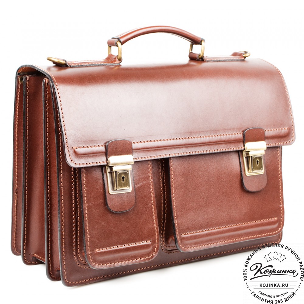 Портфель из 100% натуральной толстой кожи, закрывается на удобные классические пряжки. Внутри три удобных отдела - основной отдел разделён двумя перегородками. В каждой перегородке имеется карман на молнии. На передней стенке портфеля располагаются два удобных накладных объёмных кармана.