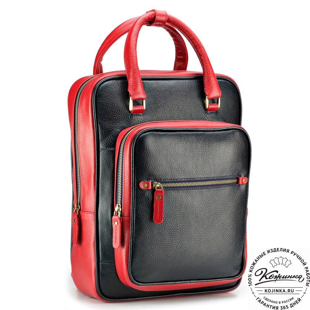 Кожаный рюкзак "Касандра" (синий с красным) - идеально подойдет всем, кому нужно носить с собой книги, тетради, альбомы или документы формата А4 и больше!