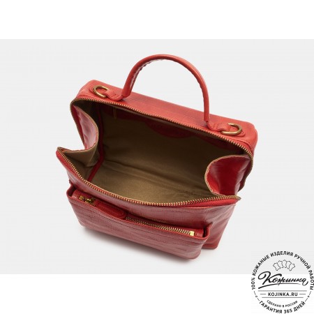 Модель средних размеров, с одним вместительным отделением. Внутри подкладка из ткани и большой карман на молнии посередине, который разделяет основное отделение на две части.