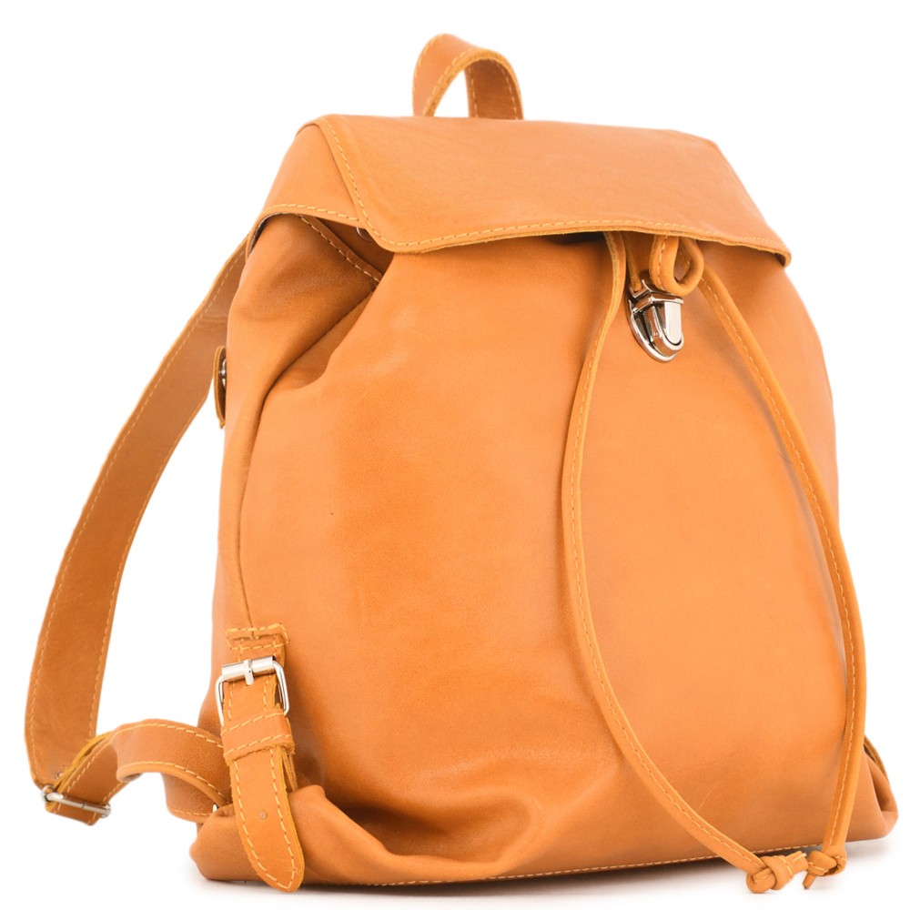 Рюкзак имеет одно отделение, которое закрывается кожаным шнуром-стяжкой и сверху клапаном с портфельной пряжкой.
